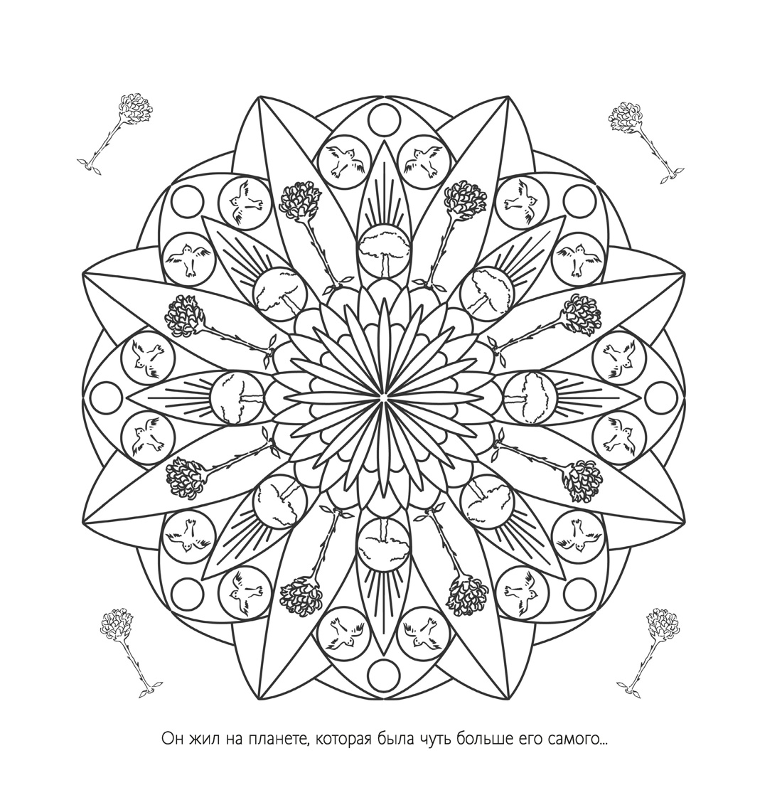 В книге собраны мандалы, вдохновленные миром Маленького принца. Для раскрашивания каждой фигуры вы можете подобрать как собственное сочетание цветов, так и использовать уже подобранное в картинках-примерах. А плотная бумага позволяет раскрашивать мандалы не только карандашами, но и фломастерами, и красками.