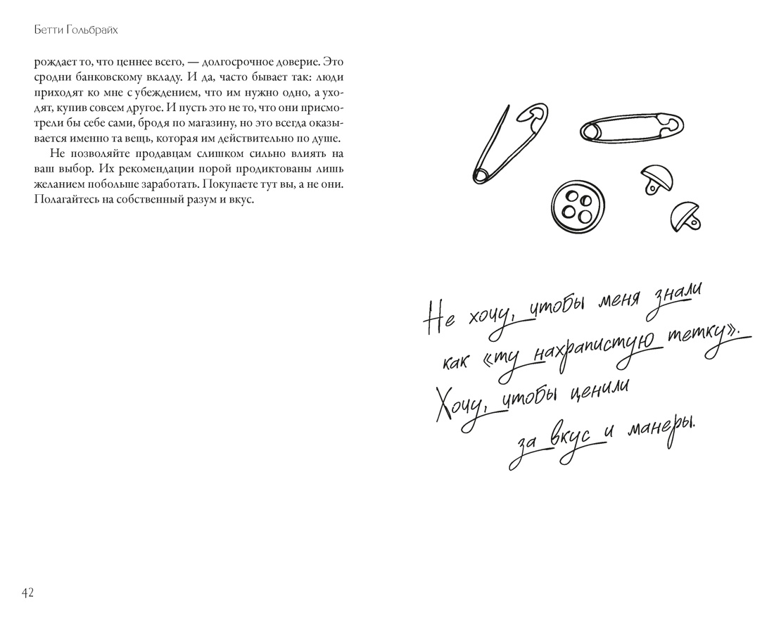 В течение полувека Бетти Гольбрайх работала в роскошном универмаге Bergdorf Goodman. Она была известна своим хорошим вкусом и помогала создавать культовые образы для сериалов «Секс в большом городе» и «Сплетница». Однако за плечами у нее были не только годы успешной карьеры, но и сложные события, которые она встречала с гордо поднятой головой. В этой книге собраны как ее советы по стилю и этикету, так и размышления об отношениях, старении, одиночестве и современной жизни. Ведь самый важный наряд — это самоощущение и уверенность.